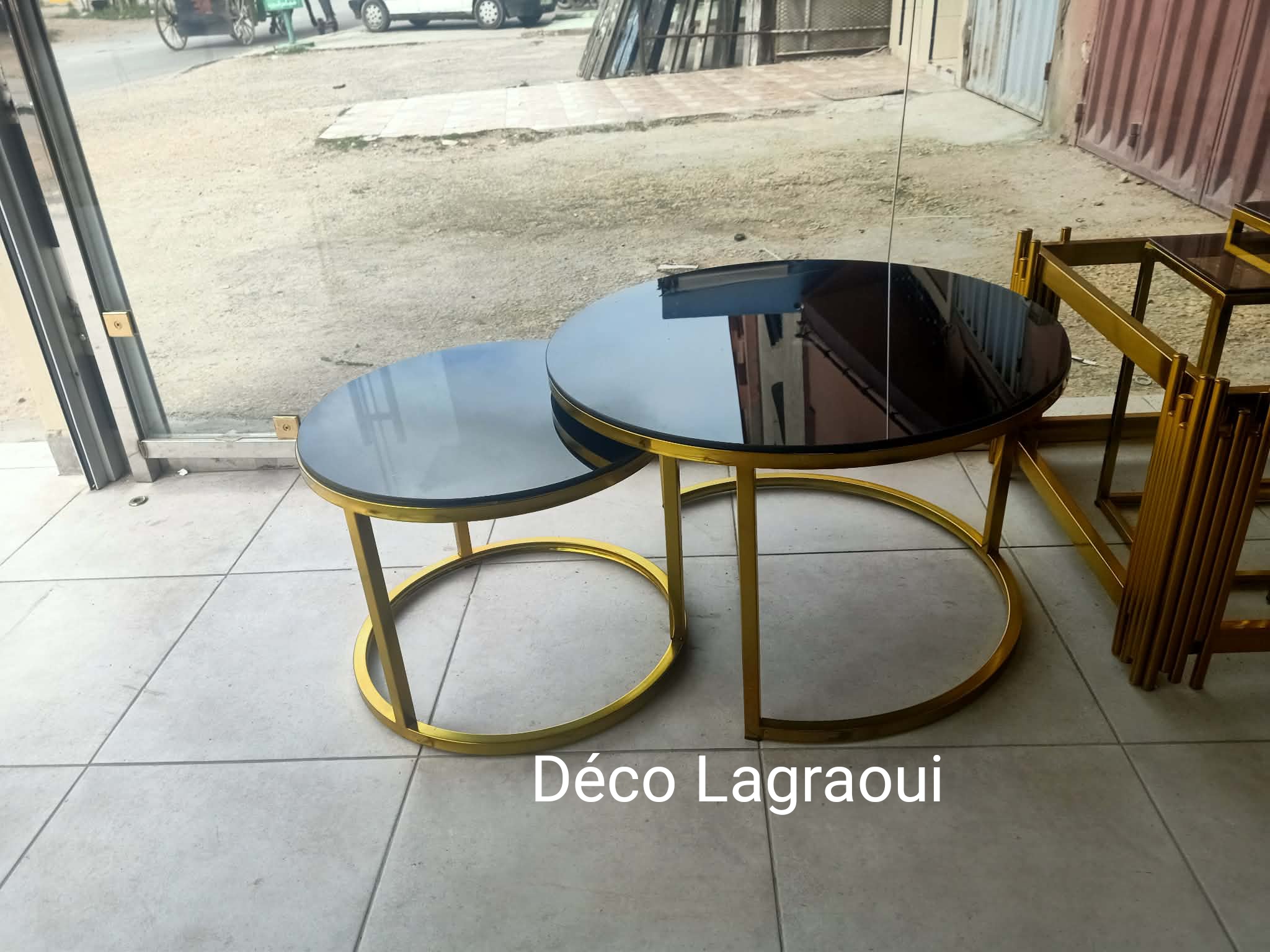 tables en inox de forme ronde, emboîtables (une qui rentre dans l’autre)...